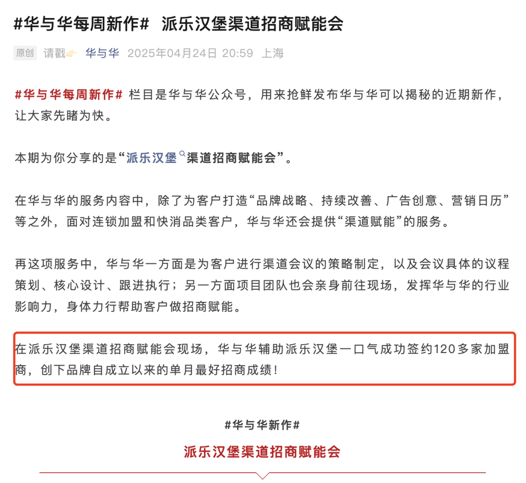 而背书,是一种信任捷径。现在华与华的官号上,依然不少靠招商加盟起盘的餐饮客户。