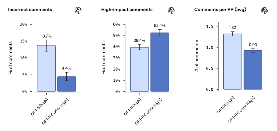 代码审查功能也很实用,它会在代码库中浏览分析,运行测试验证正确性,给出的审查意见准确性不错。在OpenAI内部,Codex现在会审查大部分PR,每天能发现数百个问题,很多时候比人工审查更早发现潜在bug。