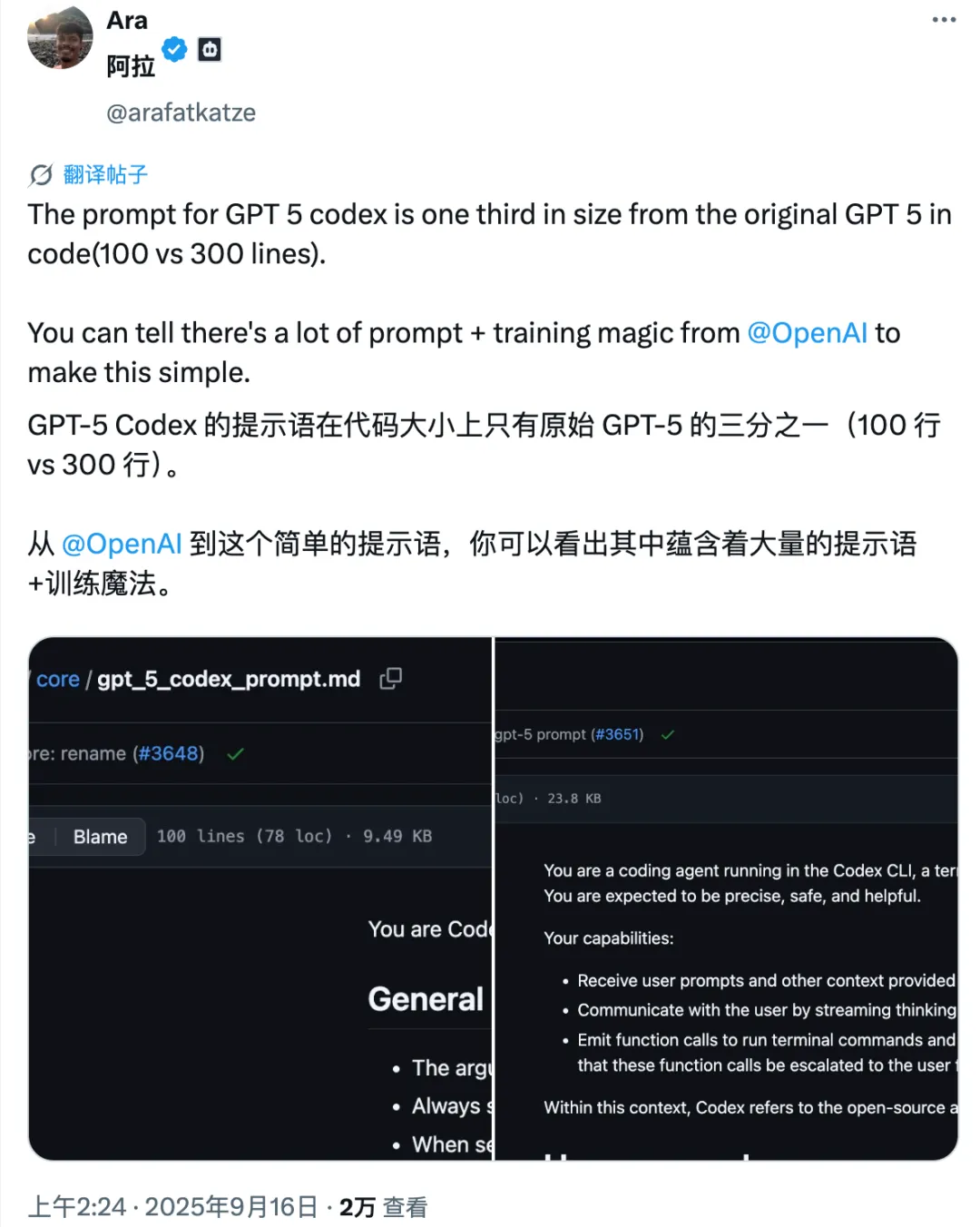 系统提示词地址:https://github.com/elder-plinius/CL4R1T4S/blob/main/OPENAI/Codex\_Sep-15-2025.md