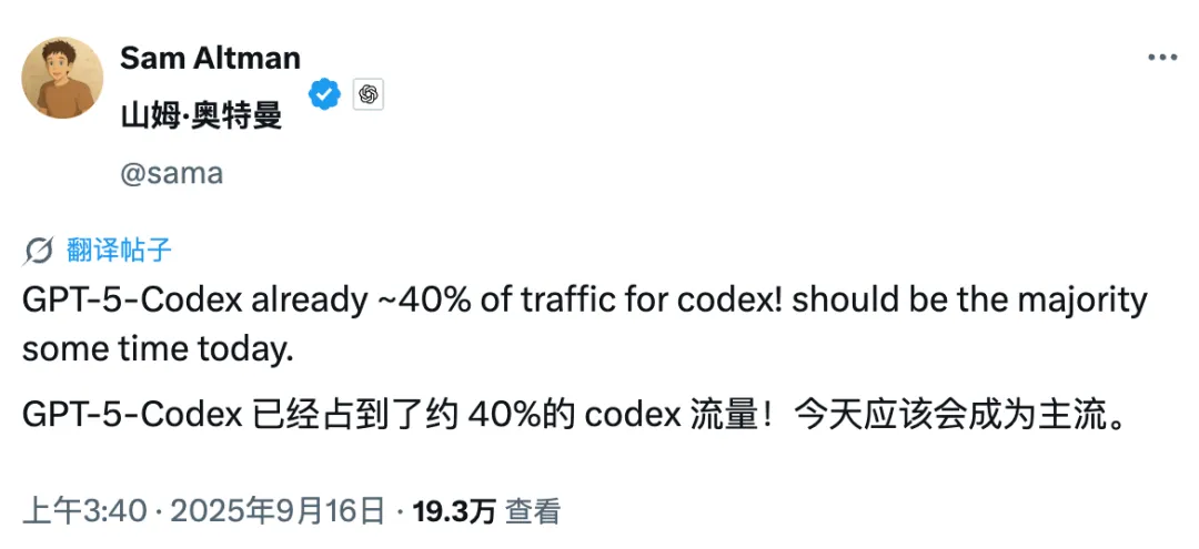 新模型上线不久后,OpenAI CEO山姆·奥特曼兴奋地透露,GPT-5-Codex已经占据了Codex总流量的近四成,他判断在今天之内,这个比例就会反超,成为平台的主要来源。