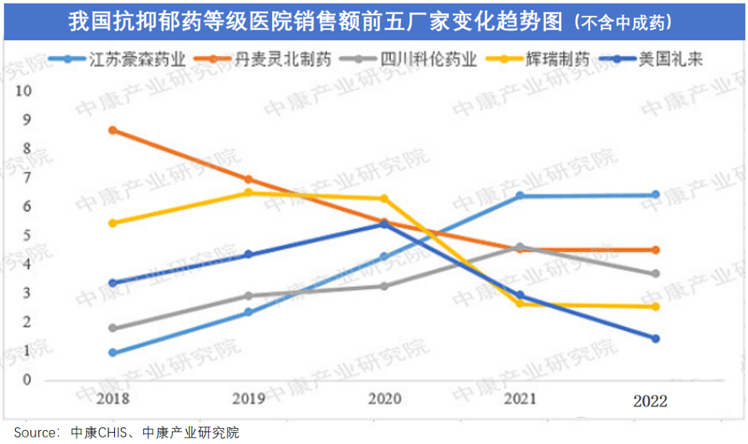 整体来看,随着多轮集采推进,抗抑郁药在等级医院销售TOP5厂家已重新洗牌,本土药企吞下了更多市场份额,豪森等企业逐渐占据领先地位。