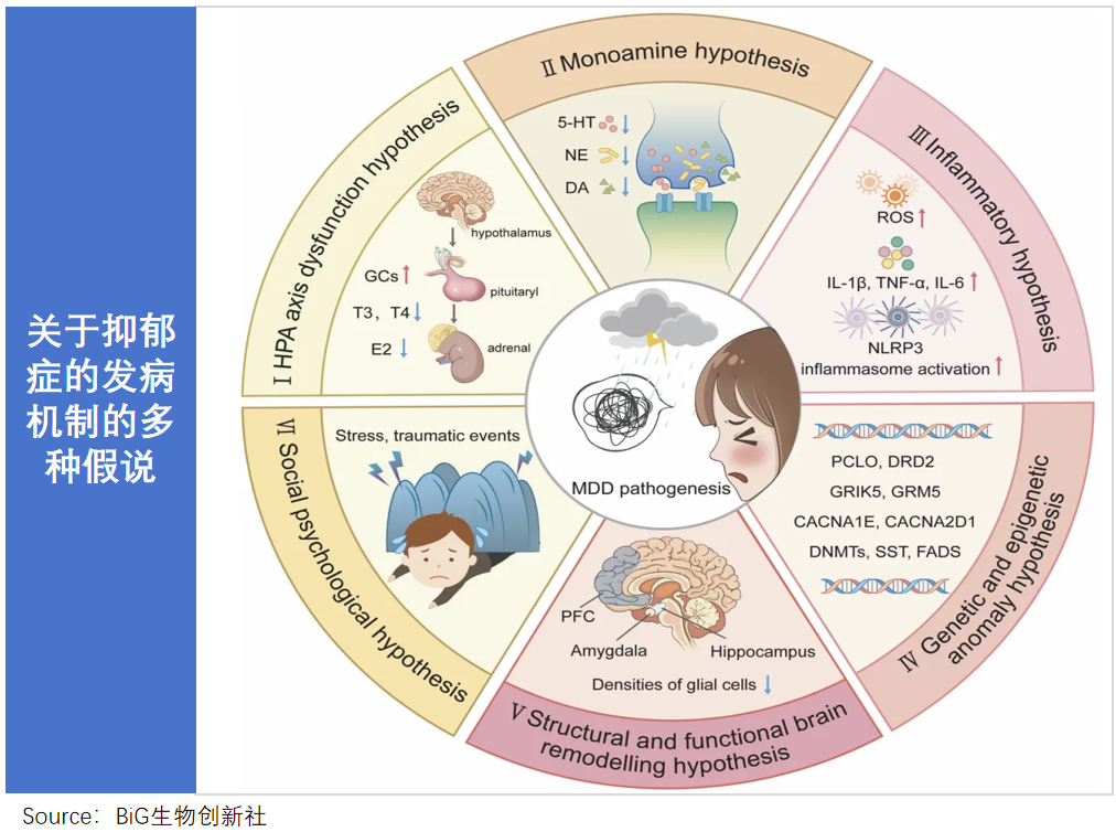 目前抑郁症发病机制尚未明确,被广泛接受的假说是与神经递质异常有关。大雷简单举例,5-羟色胺掌管着“幸福”“满足感”的开关,去甲肾上腺素让人更有活力,这些神经递质失衡,人的情绪就会“生病”。