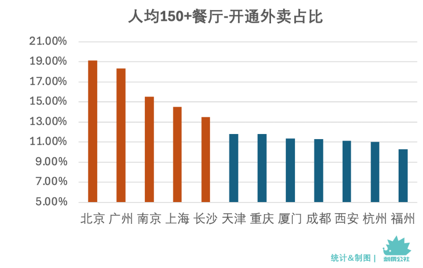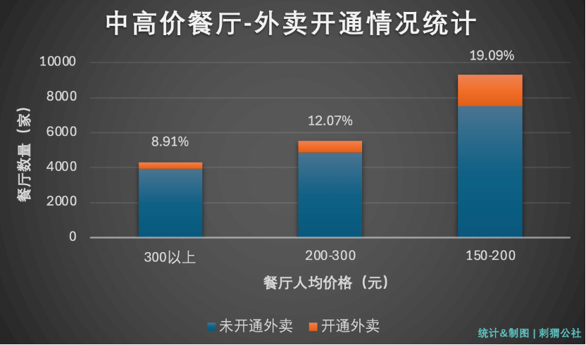 黑珍珠餐厅的数据样本量较小,我们锚定全国12个城市,对人均价格超过150元的19151家餐厅进行数据统计和分析,发现其中已开通外卖的餐厅占比为14.77%。其中,人均300+餐厅开通外卖占比为8.91%,人均200~300餐厅开通外卖占比为12.07%,人均150~200餐厅开通外卖占比为19.09%。