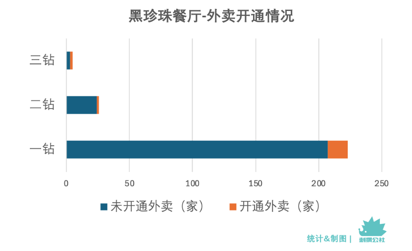 而一个反直觉的结论是,论开通外卖的渗透占比,黑珍珠三钻餐厅(40%)大于二钻餐厅(7.69%),二钻餐厅又大于一钻餐厅(7.17%)。可能是因为二、三钻餐厅整体数量较少,统计结果受单个餐厅影响较大;另一个原因是二三钻餐厅多分布在一线城市,而一线城市高端餐饮开通外卖的比例又高于二三线城市,这一地域分布特征我们将在第二部分详细讨论。