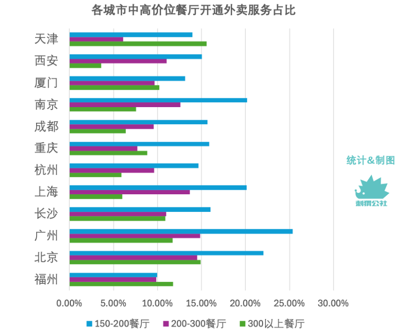 按城市分布来看,北京、广州、上海、南京的贵价餐饮外卖开通比例显著高于统计范围内的其他城市。