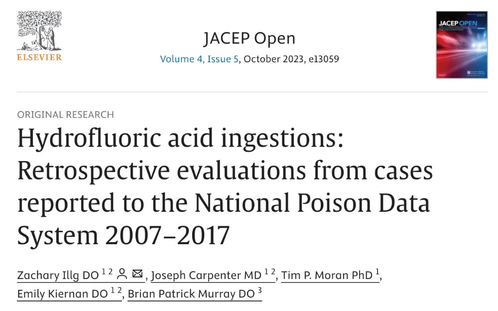2023年,美国埃默里大学医学院急诊医学系的研究人员做了一项关于氢氟酸中毒报告案例的回顾性评估,通过分析2007年至2017年10年间美国国家中毒数据系统(NPDS)收到的653例氢氟酸中毒案例(其中142例纳入最终数据分析),得出结论:45.8%的氢氟酸中毒案例导致了严重后果;6.3%的案例死亡;近一半的氢氟酸暴露(46.5%)是由于将氢氟酸转移到了未贴标签的储存容器中;让人意外的是,最常见的氢氟酸暴露地点是个人住所(78.2%),其次是工作场所(16.2%)。