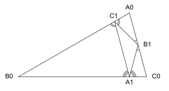 当讲到“垂足三角形”迭代并构造其对应的一类我曾参与研究并发表过几篇学术论文的分形时,我先在黑板上画上一个锐角三角形,然后从它的每一个顶点作其对边的垂线,得到的三个垂足构成原先三角形的垂足三角形,将这个三角形拿走(三条边保留下来),那么原先的大三角形内剩下三个小三角形,这完成了制造对应分形的无穷次迭代的第一次迭代,之后对每一个剩下的更小三角形如法炮制,直至无穷。为了获得最终形成的那个称之为“谢尔宾斯基垂足三角形(Sierpiński pedal triangle)”分形的维数性质,需要证明这三个小三角形都与初始选定的大三角形相似。见下图所示: