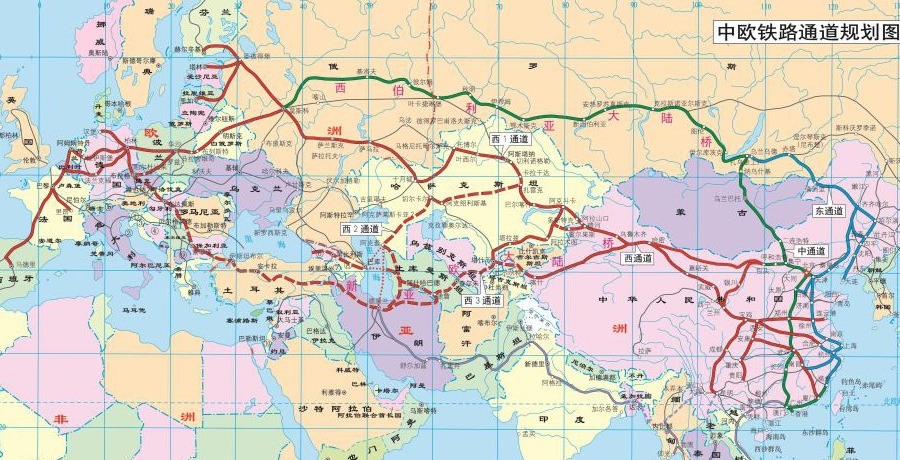 如下图所示,中国与欧洲间的陆地通道主要有两条: