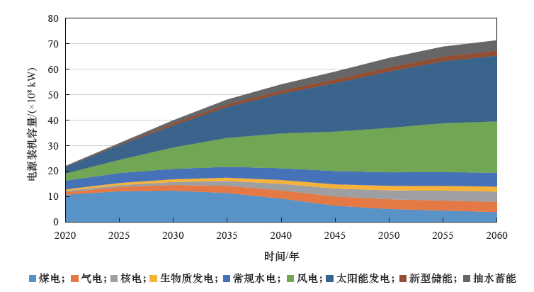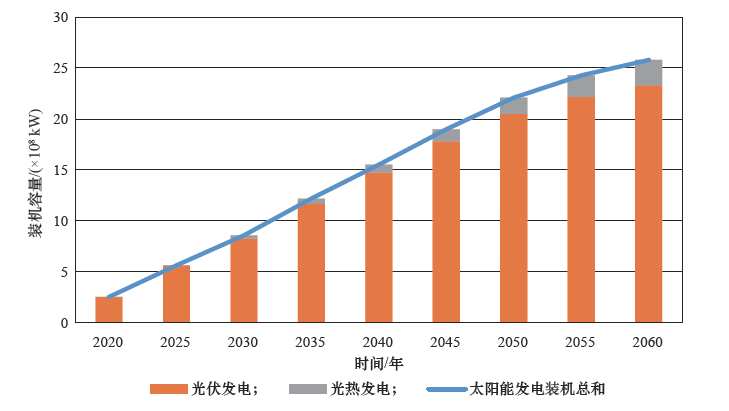 在风电方面,近期应因地制宜发展东部、中部地区的分散式风电和海上风电,优先就地消纳,同时稳步推进西部、北部地区的风电基地集约化开发;远期随着东部、中部地区的分散式风电资源基本开发完毕,风电开发重心重回西部、北部地区,同时海上风电逐步向远海拓展,预计2060 年风电装机容量为2×109 kW(含海上风电的5×108 kW)。在太阳能方面,近期仍以光伏发电为主导,优先发展东部、中部地区的分布式光伏,西部、北部地区则推动建设集中式太阳能发电基地;中远期,包括光热发电在内的太阳能发电基地建设将在西北地区及其他有条件的区域持续扩大规模,预计2060 年太阳能装机容量为2.6×109 kW( 含光热发电的2.5×108 kW)。