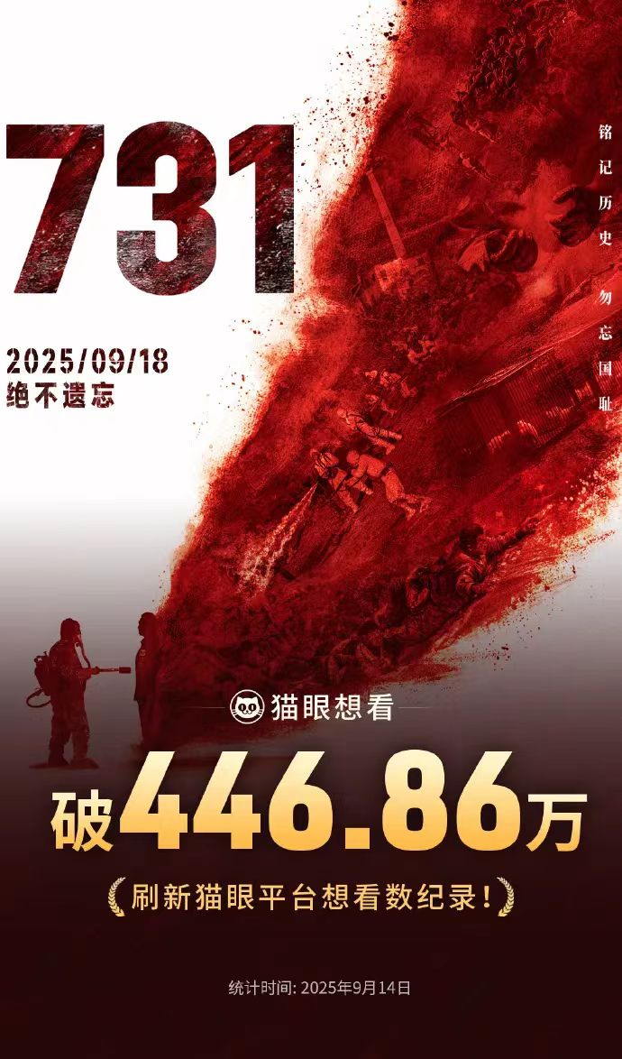446.86万,这是影片《731》截至9月14日晚间在猫眼的想看人数。