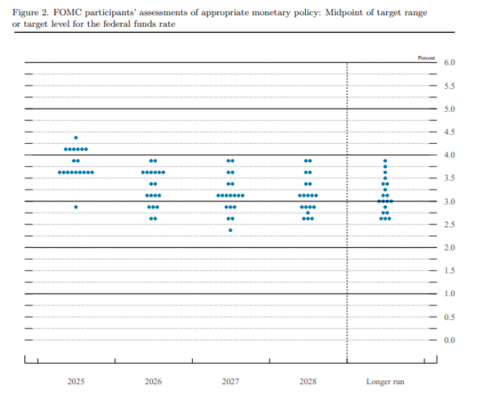 “点阵图”显示,美联储官员的中位预期是今年底之前再降息0.5个百分点。这意味着决策层倾向于在今年余下的两次议息会议上各再降息25个基点,使年底利率区间降至大约3.5%~3.75%的水平。