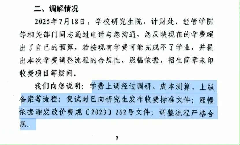 据澎湃新闻,2025年7月11日,学生们还向湖南省信访局反映了该问题。7月18日,学生们收到了校方回应。中南林业科技大学表示,学费上调经过调研、成本测算和上级备案等流程,且涨幅依据“湘发改价费规〔2023〕262号”文件,调整流程严格合规。