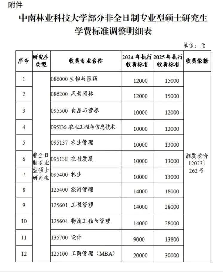 中南林业科技大学部分非全日制学费标准调整明细表/图源:中南林业科技大学财务处官网
