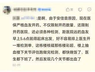 “仅限出血”并不是一条新规定,只是在项欢的记忆中,过去只要向医生描述“关节肿了、有刺痛感”,通常就能开到需要的药物。医生愿意信任患者,也会考虑患者的现实需求——出血早期往往难以通过B超判断,等影像能够显示积液,出血量已经十分严重,会对关节造成不可逆的伤害。
