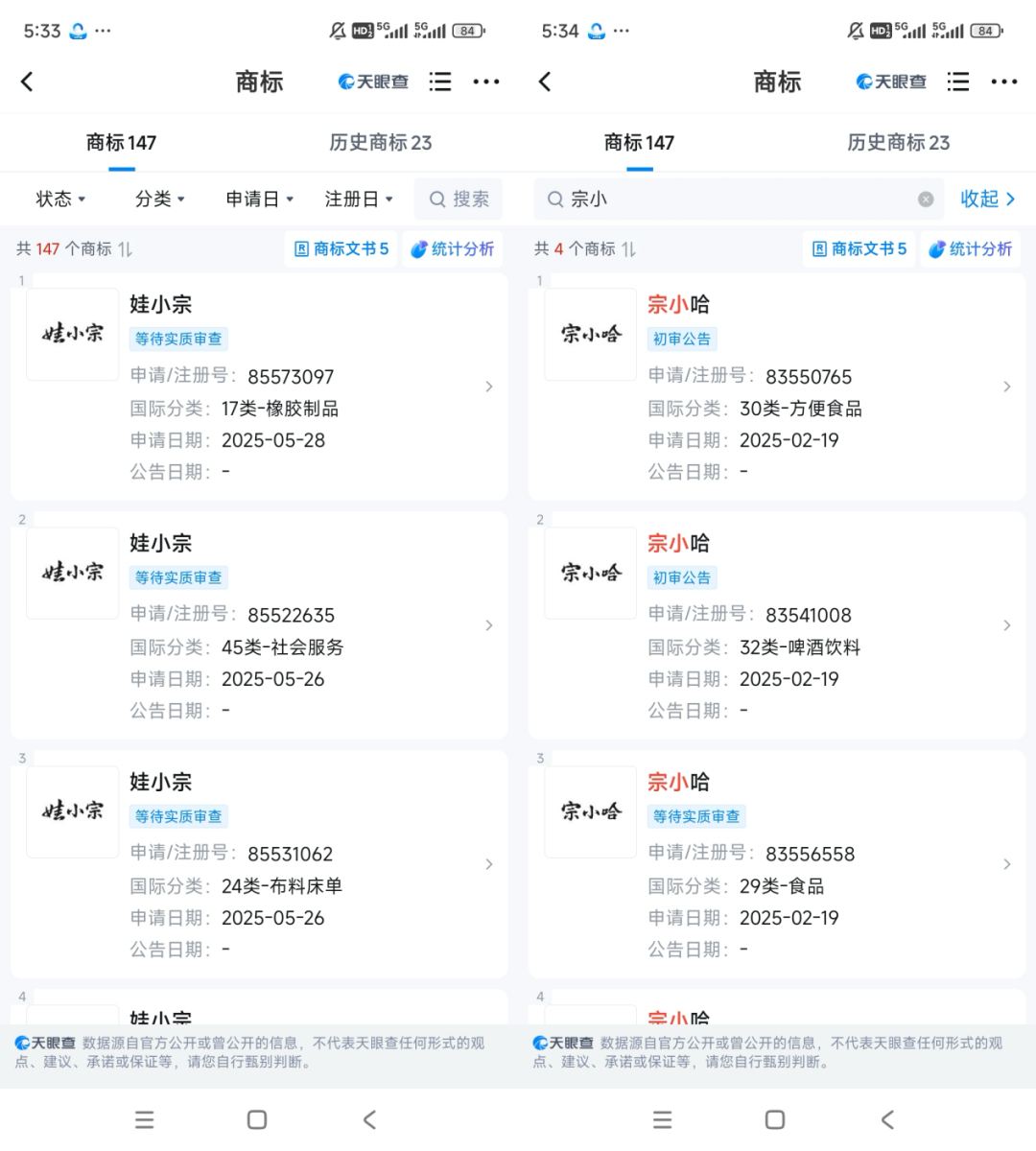 事实上,关于“另立门户”,宗馥莉早在今年2月就着手准备。天眼查App显示,2月19日娃小宗多个类目商标被申请注册,归属于宏胜饮料集团有限公司,该公司正是由宗馥莉实控。同期,宏胜还申请注册了宗小哈、娃小哈等商标,5月又以“娃小宗”商标申请注册了多类目商品。
