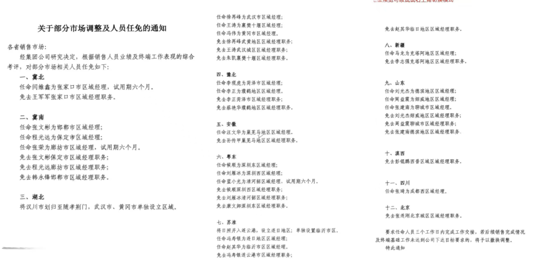 同时,《BUG》栏目也获悉,7月娃哈哈又对全国销售市场进行了大调整,包括冀北、冀南、湖北、安徽、豫北等十二个地区的区域经理都出现了免职或者替换的现象。