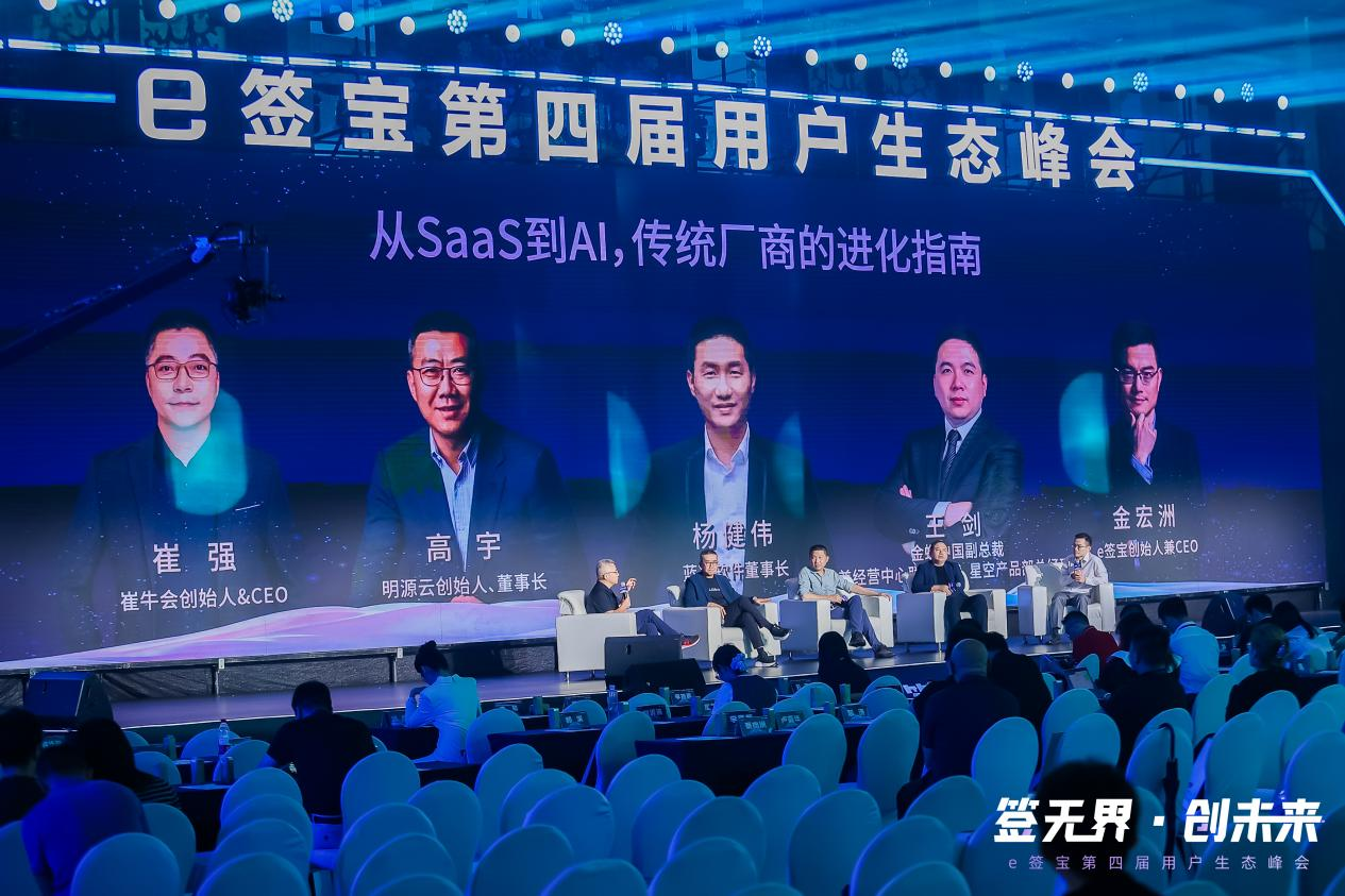 圆桌论坛环节,崔牛会创始人兼CEO崔强、明源云创始人兼董事长高宇、蓝凌软件董事长杨健伟、金蝶中国副总裁王剑与e签宝CEO金宏洲,围绕“从SaaS到AI,传统厂商的进化指南”这一主题展开深度对话,为业界提供了前瞻性的发展思路。