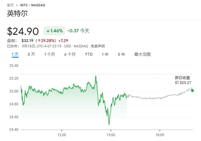 消息公布后,英特尔美股盘前一度暴涨30%,英伟达的另一个竞争对手AMD跳水,跌幅超过4%。
