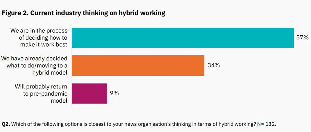 路透新闻研究院的报告显示,大多数(89%)受访者都同意采取混合办公模式。然而,真正的问题在于新闻机构如何向混合办公模式过渡。