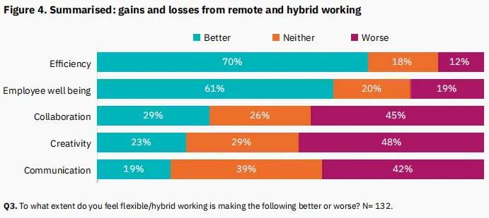 混合办公模式也有明显的弊端。路透新闻研究院的受访者表示,他们觉得远程工作削弱员工的创造、沟通、合作等软技能。将近半数(48%)的受访者觉得新闻机构的创造力变差了,43%的受访者觉得自身的沟通能力也弱化了。