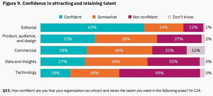 具体来看,如何吸引和留住技术、数据分析和商业运营这三方面的人才是关键。只有28%的受访者有信心招到和留住商业类人才,27%对应数据分析类人才,仅有18%对应技术领域的人才。与此相反的是,受访者更有信心(63%)留住编辑类人才。