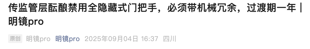 相比特斯拉,中国这边先行一步,在 9 月初就已经有爆料称,相关部门考虑从政策层面禁用传统的隐藏式门把手,针对的是中国市场的所有车企。