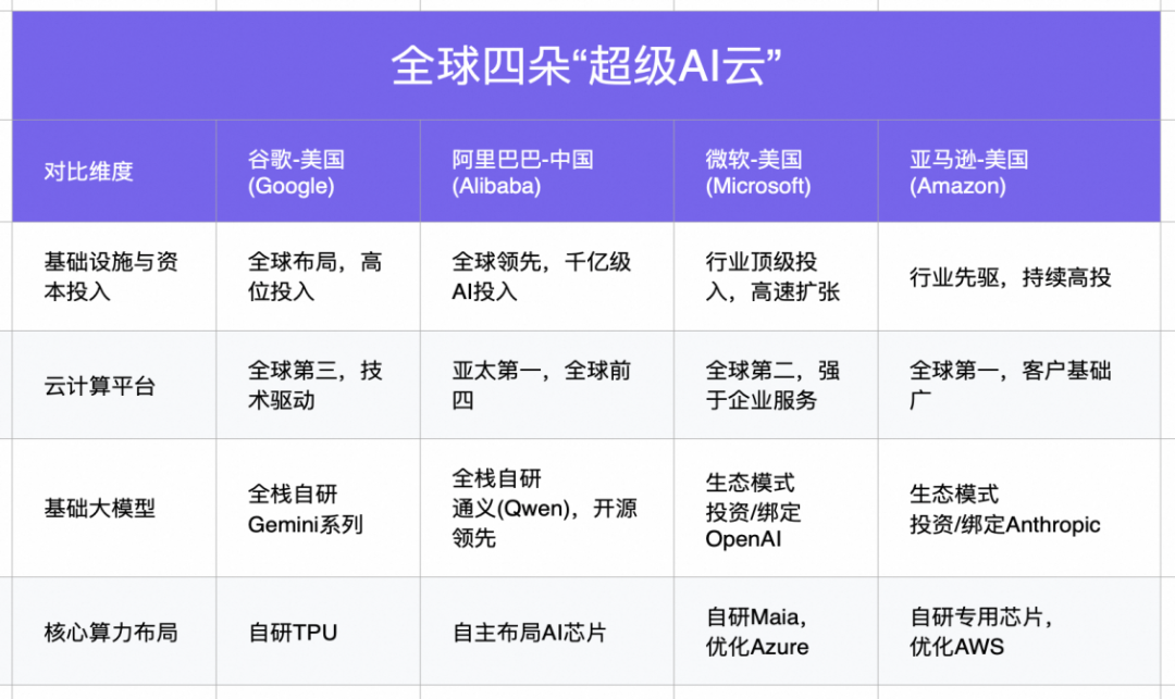 至此,全球“超级AI云”的牌桌格局已经形成:美国三家,中国一家。这四家公司,正在成为定义下一代技术基础设施的核心力量,并深远地影响未来的全球产业格局。