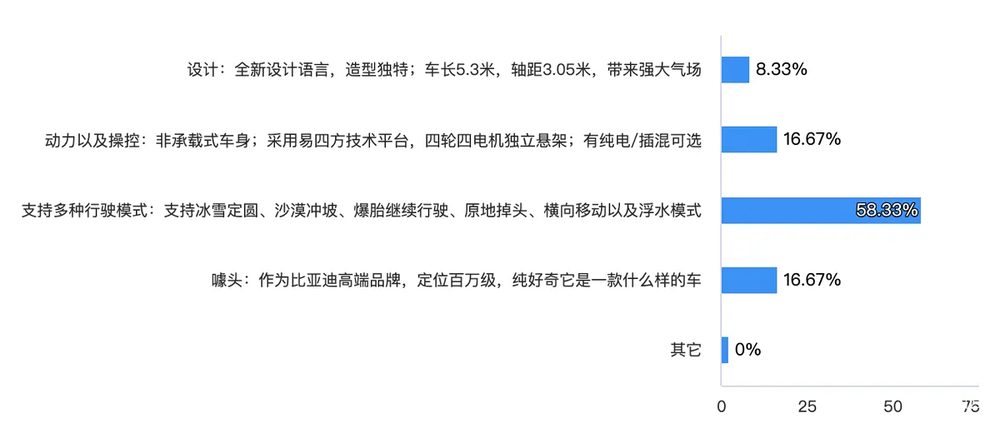 这份对于“极致”的追求,也是仰望最能打动消费者的特点。在一份对仰望U8用户的调研,他们对于U8强大行驶能力和安全特性最为关心,甚至超越了空间、动力、品牌等寻常需求。