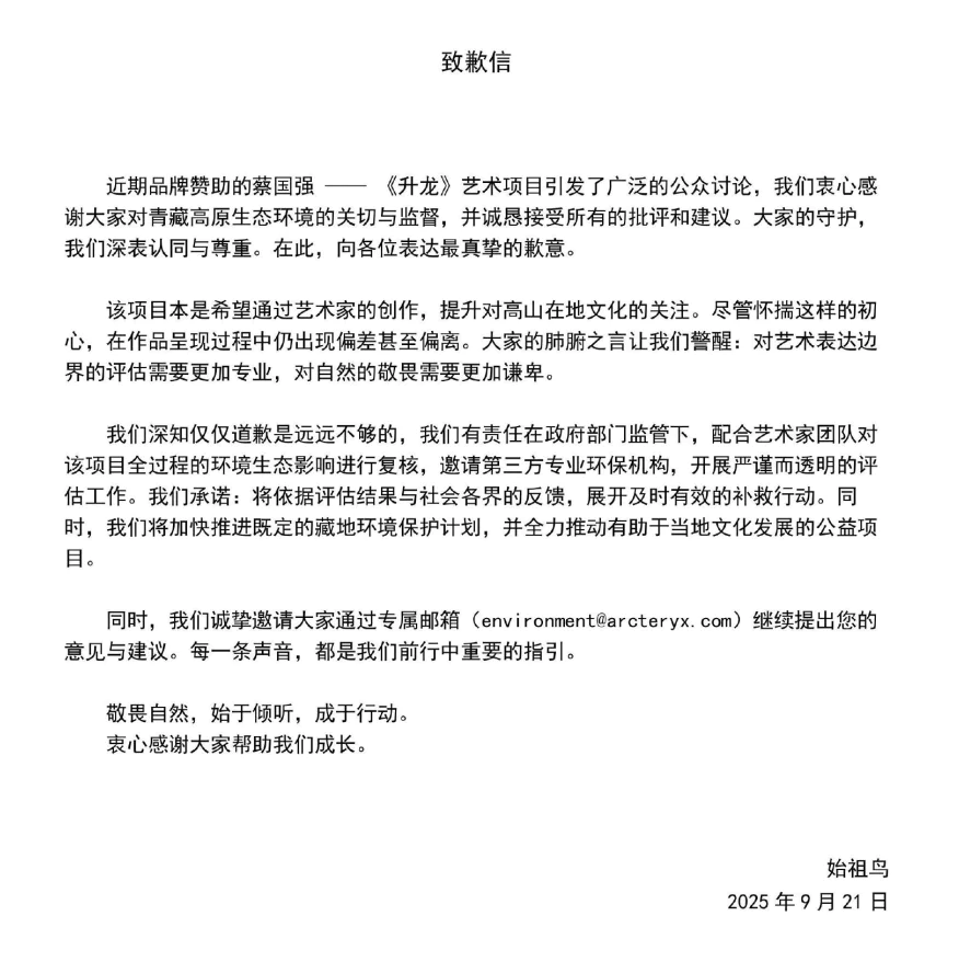 9月21日上午八点左右,始祖鸟和蔡国强工作室分别发布道歉信: