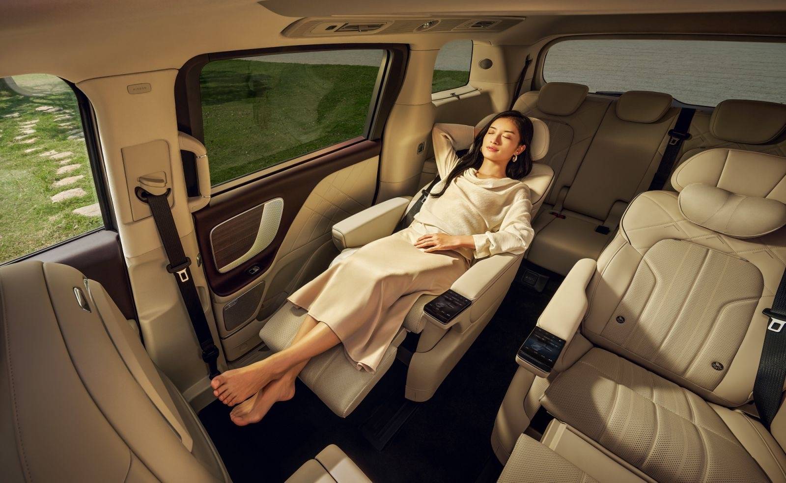 该车全球首发26点叩击式按摩+AI零重力按摩舱,让MPV瞬间化身为移动的Spa馆,二排娱乐屏还可以满足家人的娱乐需求。二排电动隐私帘、迎宾模式、前排搭载双静音电吸门、AR感应后尾门,也从细节上彰显尊贵感。