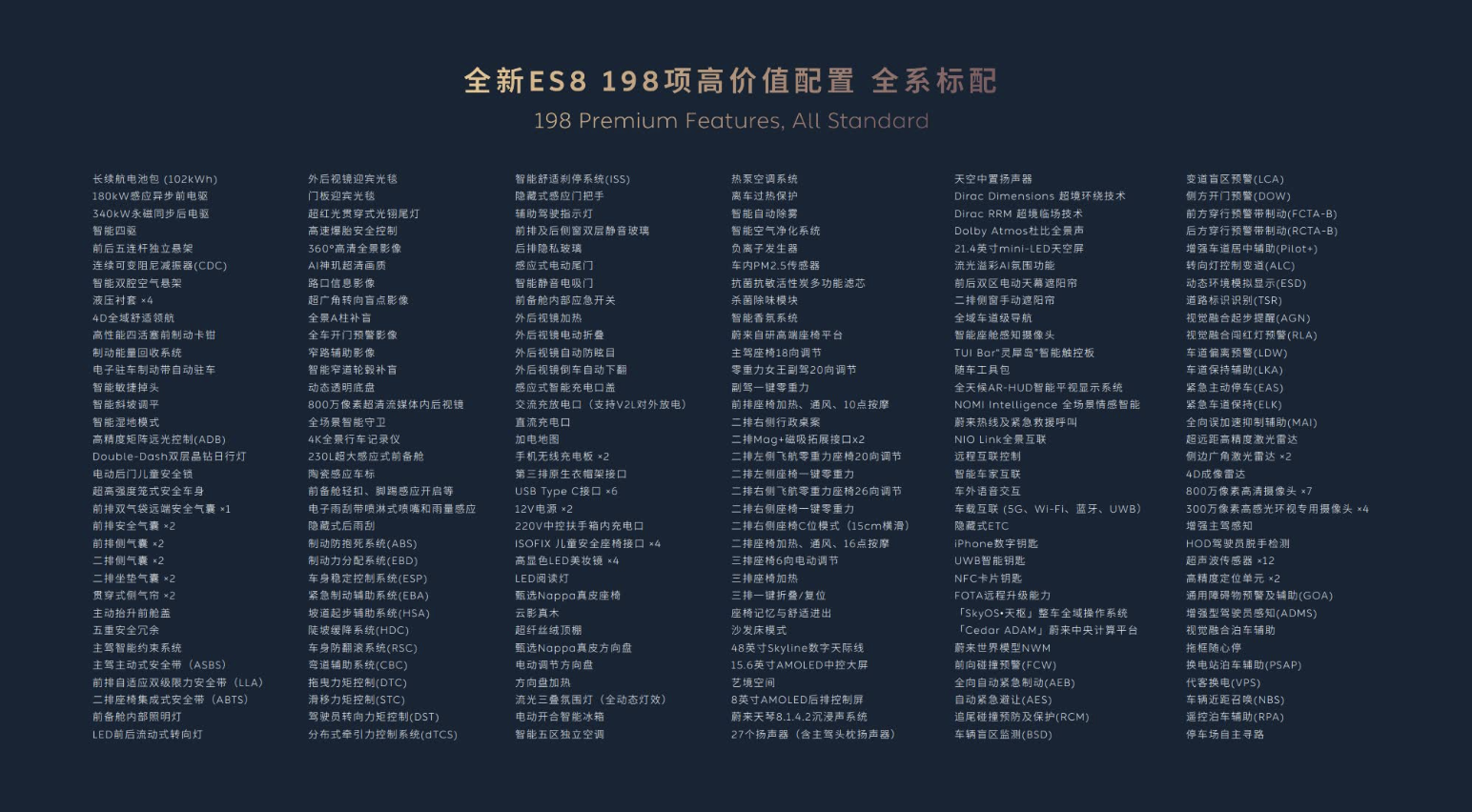 蔚来发布会ppt图,展示了198项标配配置