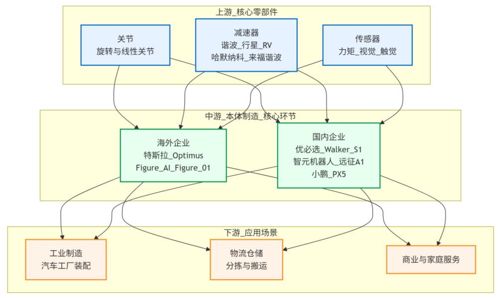 人形机器人产业链可划分为上游核心零部件、中游本体制造和下游场景应用三大环节。