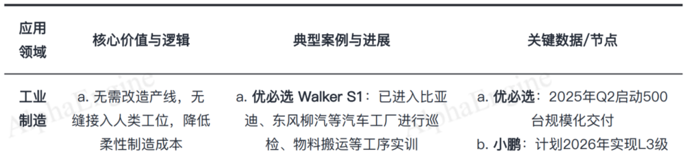 工业制造是首要落地场景,特别是汽车工厂,如优必选 Walker S1 已进入比亚迪和东风柳汽的产线进行实训。