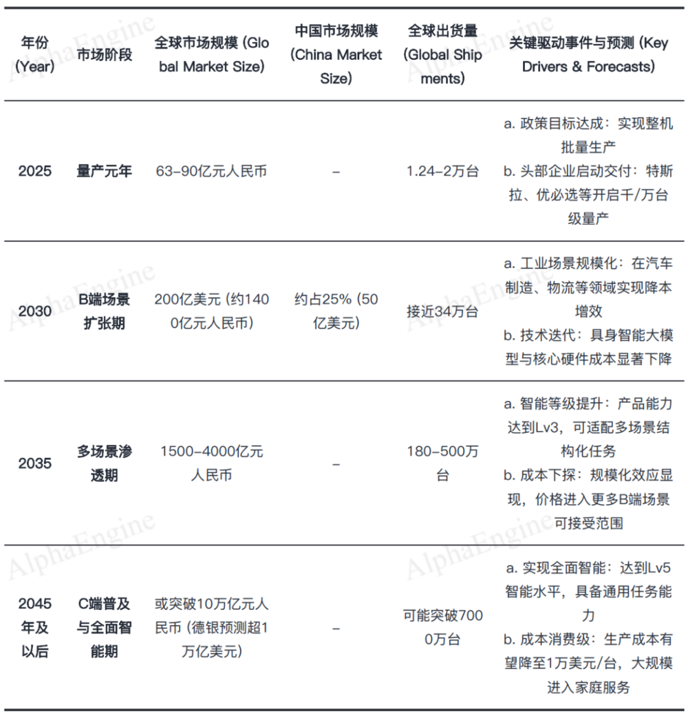 长期来看,人形机器人有望实现 C 端普及,全球出货量超 7000 万台,市场规模突破 10 万亿元。