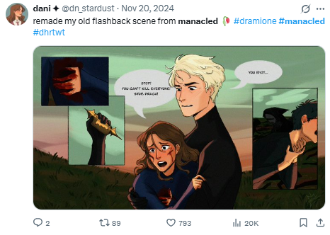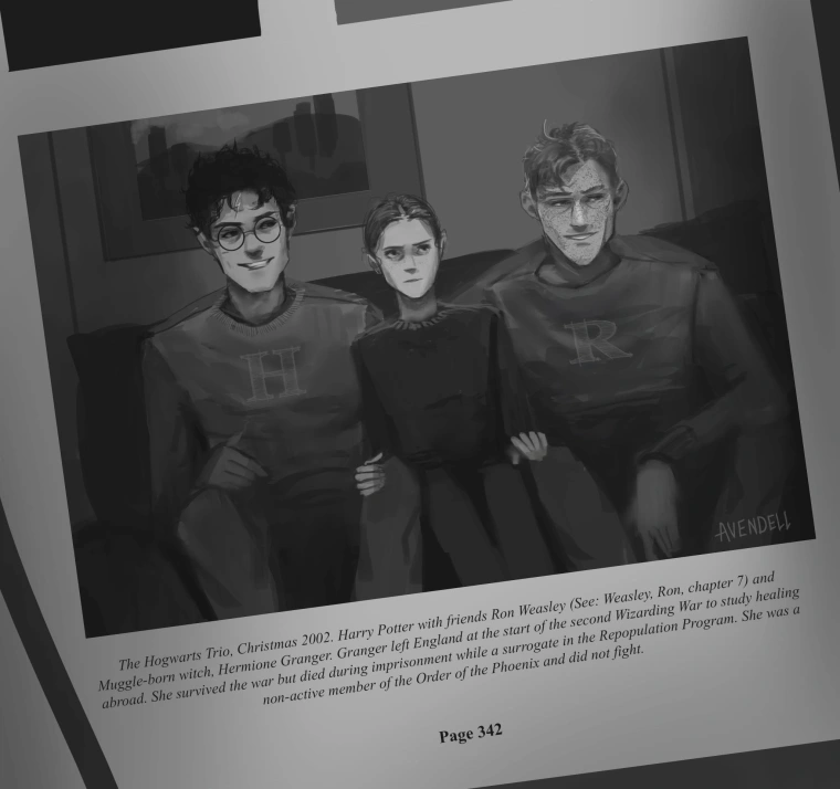 这部同人小说没有简单地以CP二人幸终的情节来结尾,而是跳到了未来的场景:某人正在阅读一本历史书。其中,历史用一个章节记住了马尔福,赫敏却只出现在了一张合照、一段图注里:她是麻瓜,哈利·波特的朋友,凤凰社的非活跃成员,没有参与战斗。