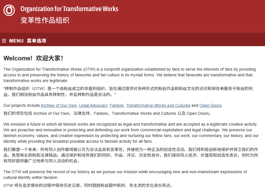 为了保护同人创作的权利,“作品再创作组织”(Organization for Transformative Works,以下简称OTW)不仅建立了AO3,也经过法律维权和理论建构使得同人免因版权法攻击而下架,但这一切都建立在一个共识之上:同人创作是非商业化的。