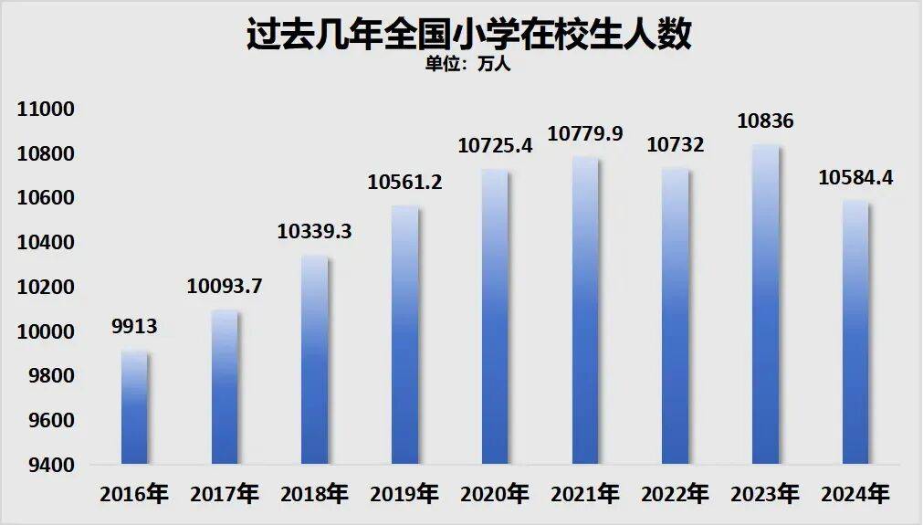 据教育部公布的数据显示,2022年,小学在校生人数迎来2014年以来的首次下降。2024年,全国小学招生1616.63万人,比上年减少261.25万人。 图源:城市财经