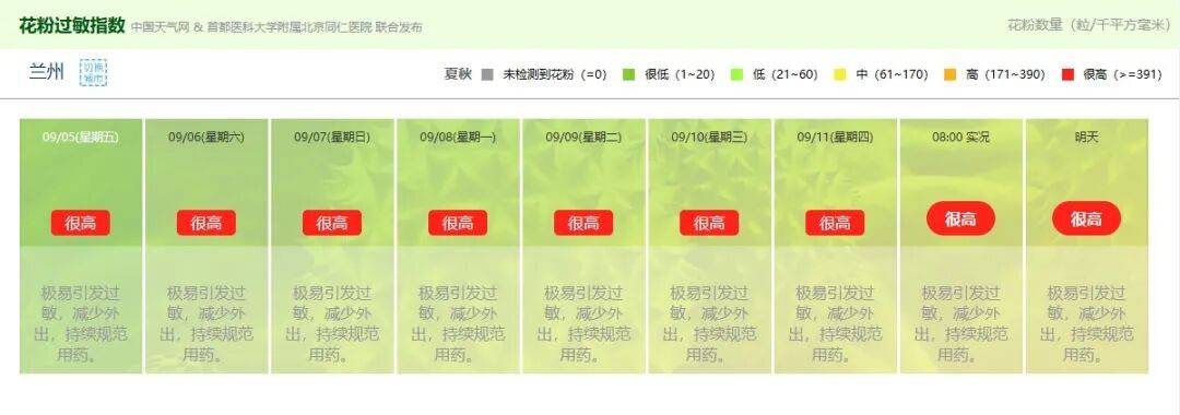 △9月,兰州的花粉过敏指数处于“很高”的水平。(图/中国天气网)