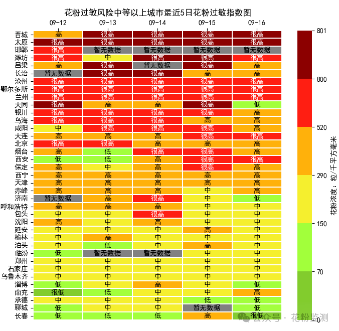 △9月12日至9月16日花粉过敏风险较高的城市。(图/花粉监测)