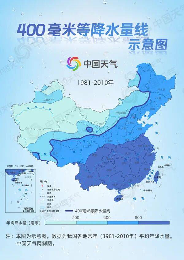 中国年降水量大致上从东南沿海向西北内陆递减,各地区差别很大。从中国年降水量分布情况来看,400毫米等降水量线大致在大兴安岭—张家口—兰州—拉萨—喜马拉雅山东南端一线。据中国天气网的数据分析,1951年至2022年期间,这条等降水量线会在某些年份出现明显的南北波动,但整体上相对稳定。