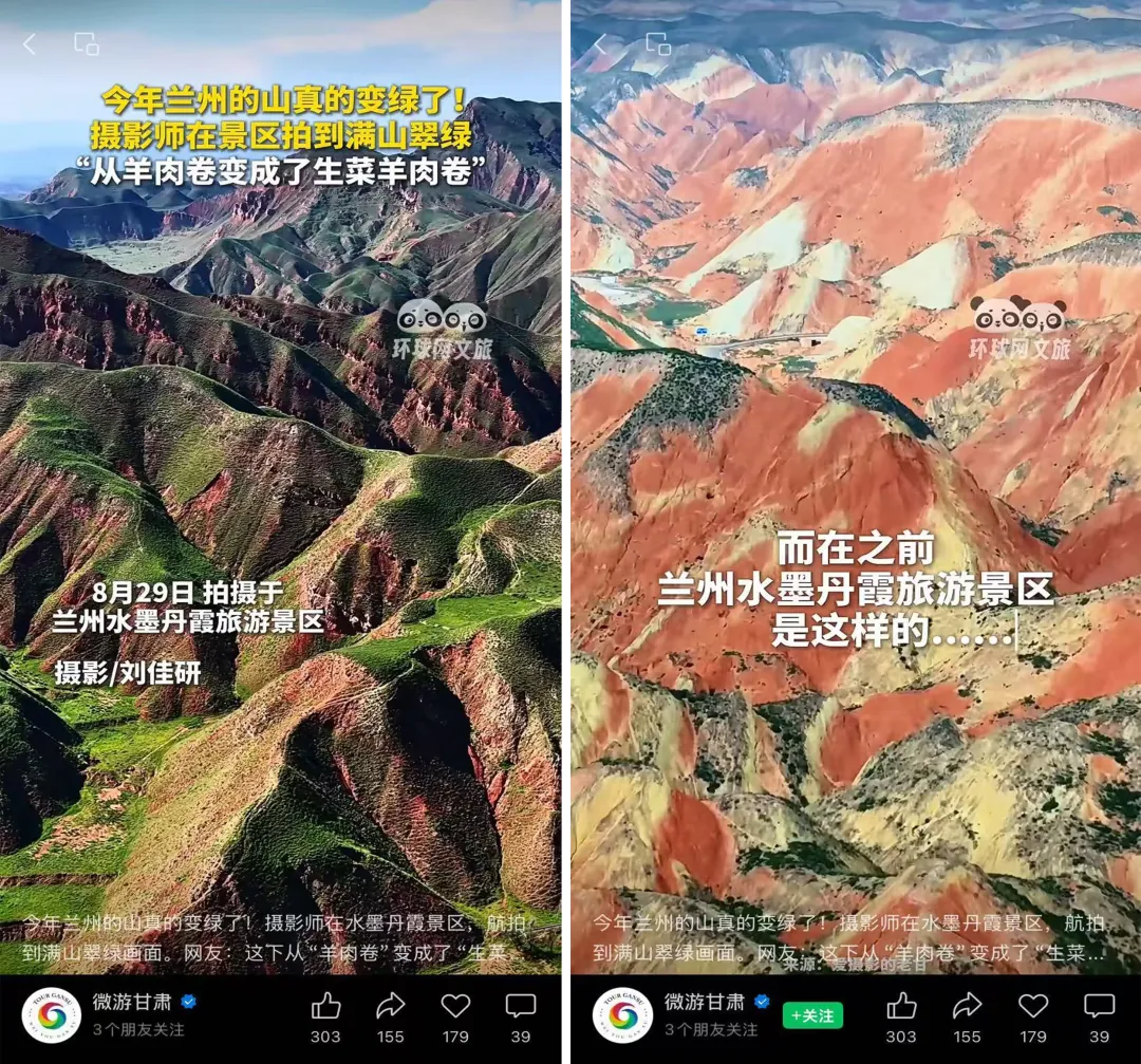 8月初,有网友从兰州中川机场起飞,感叹“这还是黄土高原吗,绿得我快不认识了”。9月初,兰州市郊“水墨丹霞”景区,原本漫山遍野都是橘红色的色调,阴坡的主色调竟变成了抹茶绿。有网友调侃说,以前是羊肉卷,现在是生菜包羊肉卷。