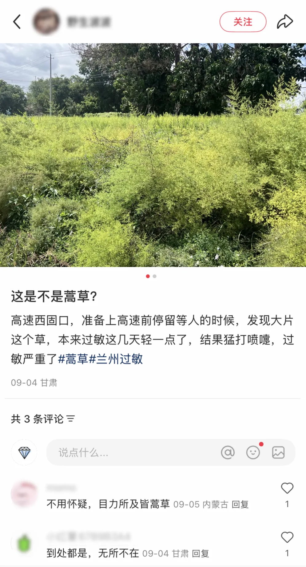 △兰州网友分享的蒿草过敏情况。(图/小红书截图)