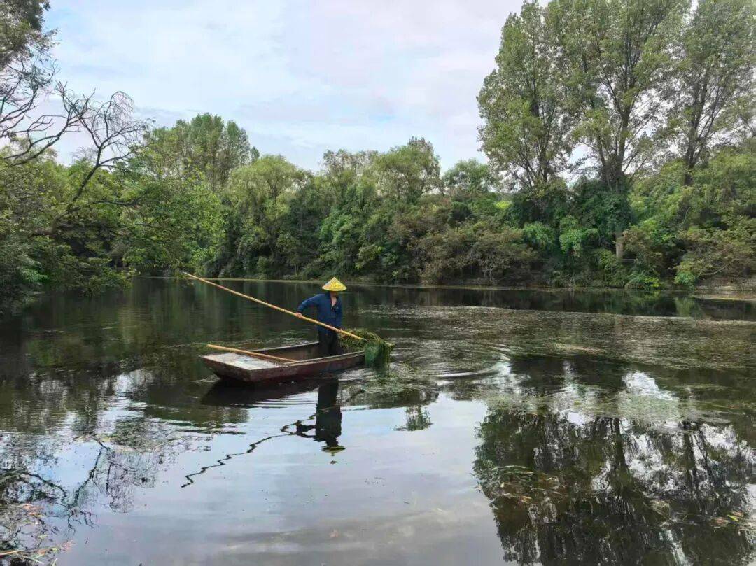 一位老人在打捞水草。他划着船,长长的杆子插入水底,再把水里的草捞起来放船上。他在劳作,却成了风景。我很喜欢卞之琳的《断章》,“你站在桥上看风景,看风景的人在楼上看你。明月装饰了你的窗子,你装饰了别人的梦”。当年,我遇见花溪河的水和桥时,映入脑中的便是这首诗。此情此景,竟重新勾起思绪。