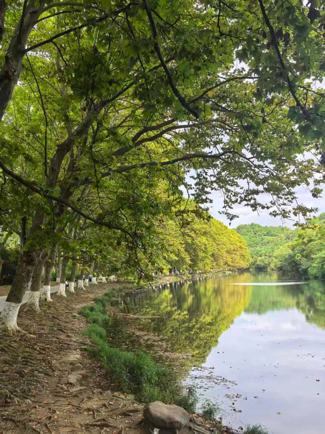 沿平桥往里走,很快就到了心心念念的黄金大道。所谓黄金大道,平桥上游,花溪水库下的一条路,旁边种满了梧桐树。秋季,梧桐叶黄,落入道中,如黄金遍地,灿烂如阳。九月的中旬,大道虽无黄金,但梧桐树叶已经开始泛黄,和安静的河水接天连叶,仍有一番韵味。