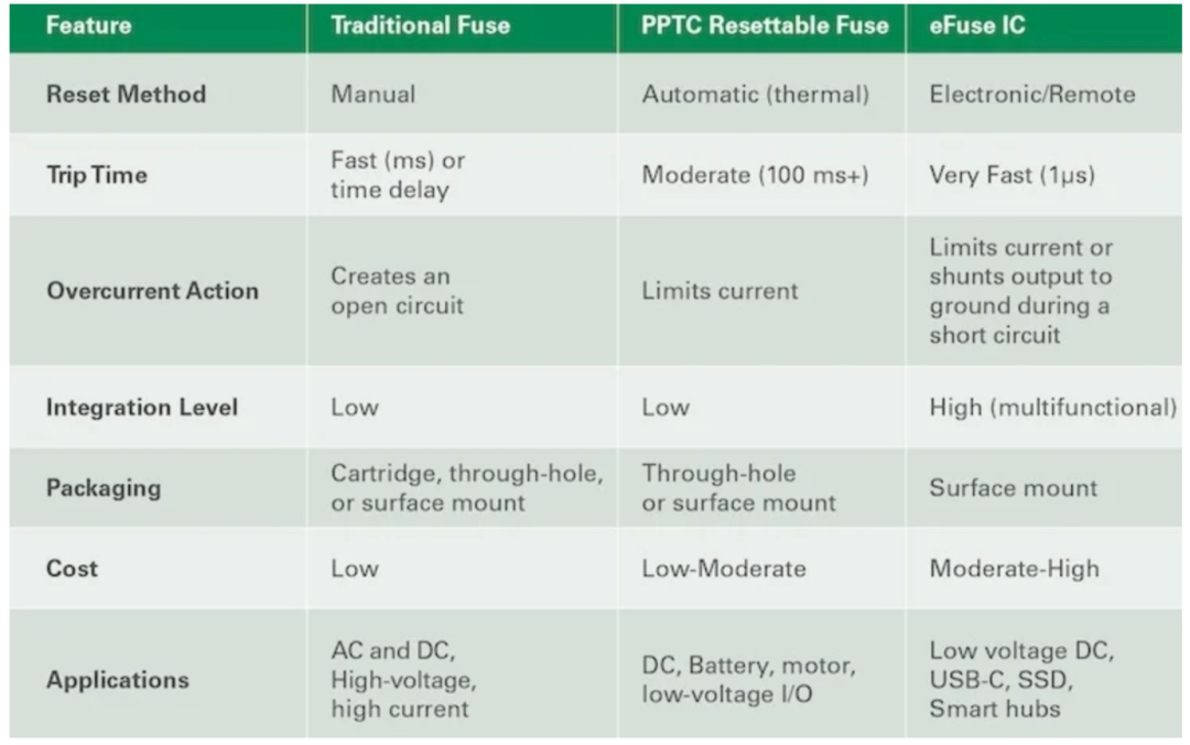 电子保险丝(eFuse):集成功率MOSFET与控制和保护逻辑的集成电路,能提供快速精确的过流保护,不少型号还集成过压保护、热关断、反向电流阻断、软启动和故障报告等功能。它响应时间极快,电流限值和故障阈值可编辑,支持远程复位与诊断,但成本高于传统保险丝和PPTC,需要偏置电源且部分需集成MCU,适合USB-C供电端口、嵌入式控制模块、固态硬盘(SSD)、物联网集线器、汽车、服务器等需紧凑型智能保护的场景。