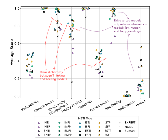 还有个比较抽象的是,那些“E型(外向型)”人格的AI,在故事的“可读性”、“幽默感”和“快乐结局”倾向上,又明显强于“I型(内向型)”人格。