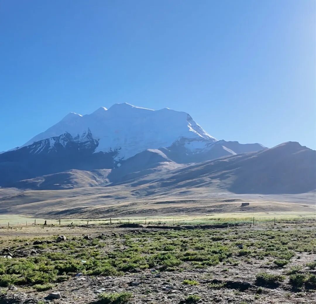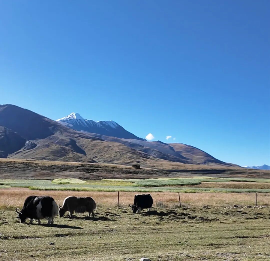 这里的气温只有零上4度,穿着一层抓绒一层羽绒服也觉得冷,不远处村落烧柴的味道混杂着路边新鲜牦牛粪的气息涌进鼻子,远处是终年积雪的卡若拉冰川,再近一些是只生长着低矮植物的高山草甸,再再近一些靠近路边的地方是牧民的草场,间杂着种着青稞…