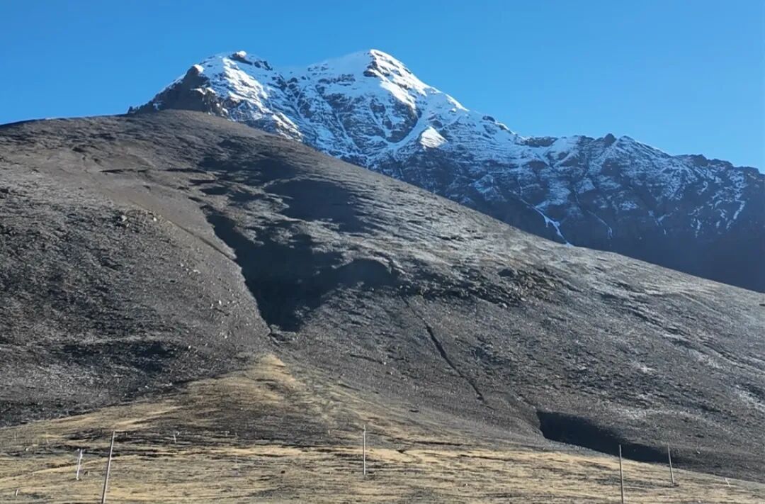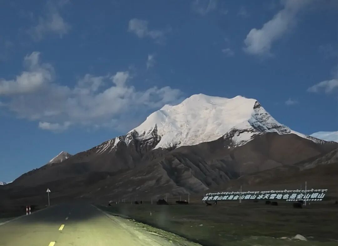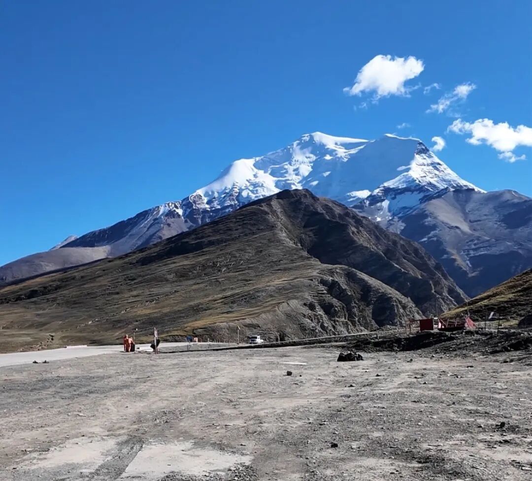 如果不是有它后面的雪山为背景,这里就是一个平平无奇的山坡,在青藏高原上遍地都是。始祖鸟和蔡国强选中它的原因,一是雪山背景,二是离国道很近,周围也有硬化过的乡村小路环绕,运输物料方便。