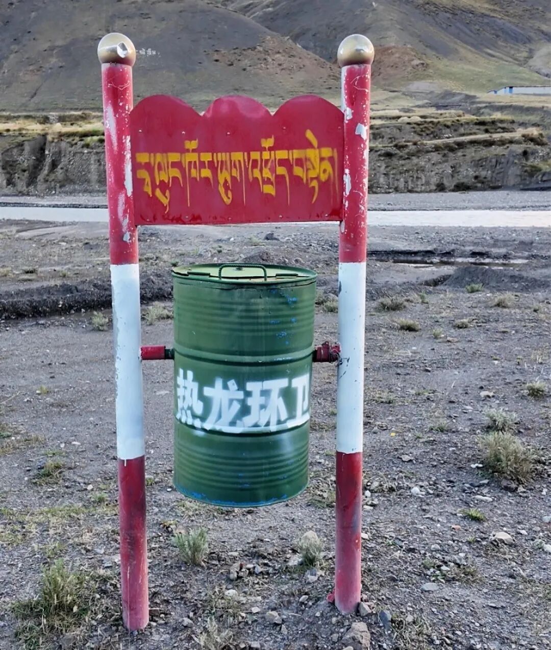 还是只说热龙乡吧。在349国道旁边无数个可以停车观景的地方,都有写着“热龙环卫”的垃圾桶,提醒人们随手把垃圾丢进这里。也许是就地取材,垃圾桶不是常见的样貌,而是把汽油桶改造一下,吊挂在架子上。