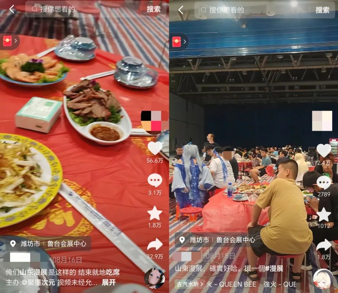 与此同时,河南焦作一家主办租借养老院700~800平的展厅办展,非节假日都能卖到1000多张票。山东潍坊的SWG漫展更是拥有8000平场地的施展空间,同样是接待300多人,主办方老蔡已经安排上了餐标水平过硬的“流水席”,票价只需80。一名游客在抖音上晒出漫展现场“吃席”的视频点赞超过56万,评论区满是羡慕的声音。